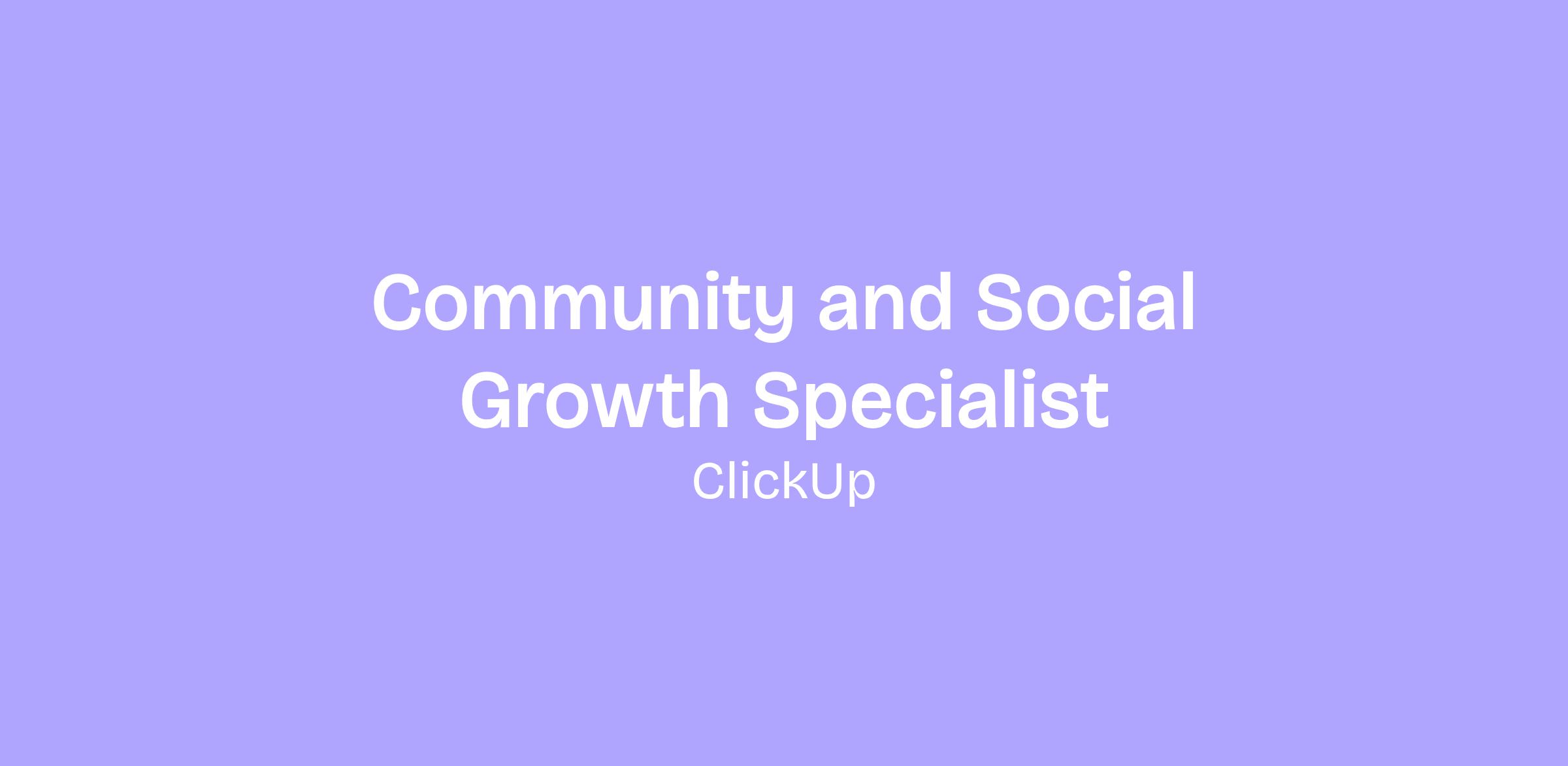 Weâre looking for a remote Community & Social Engagement Specialist to champion ClickUpâs voice across Reddit and our Verified Community. Youâll operate at the intersection of community, growth, and brand, ensuring ClickUp shows up where it matters most: in the threads and forums where people are researching tools, asking questions about our product, and sharing work management solutions.