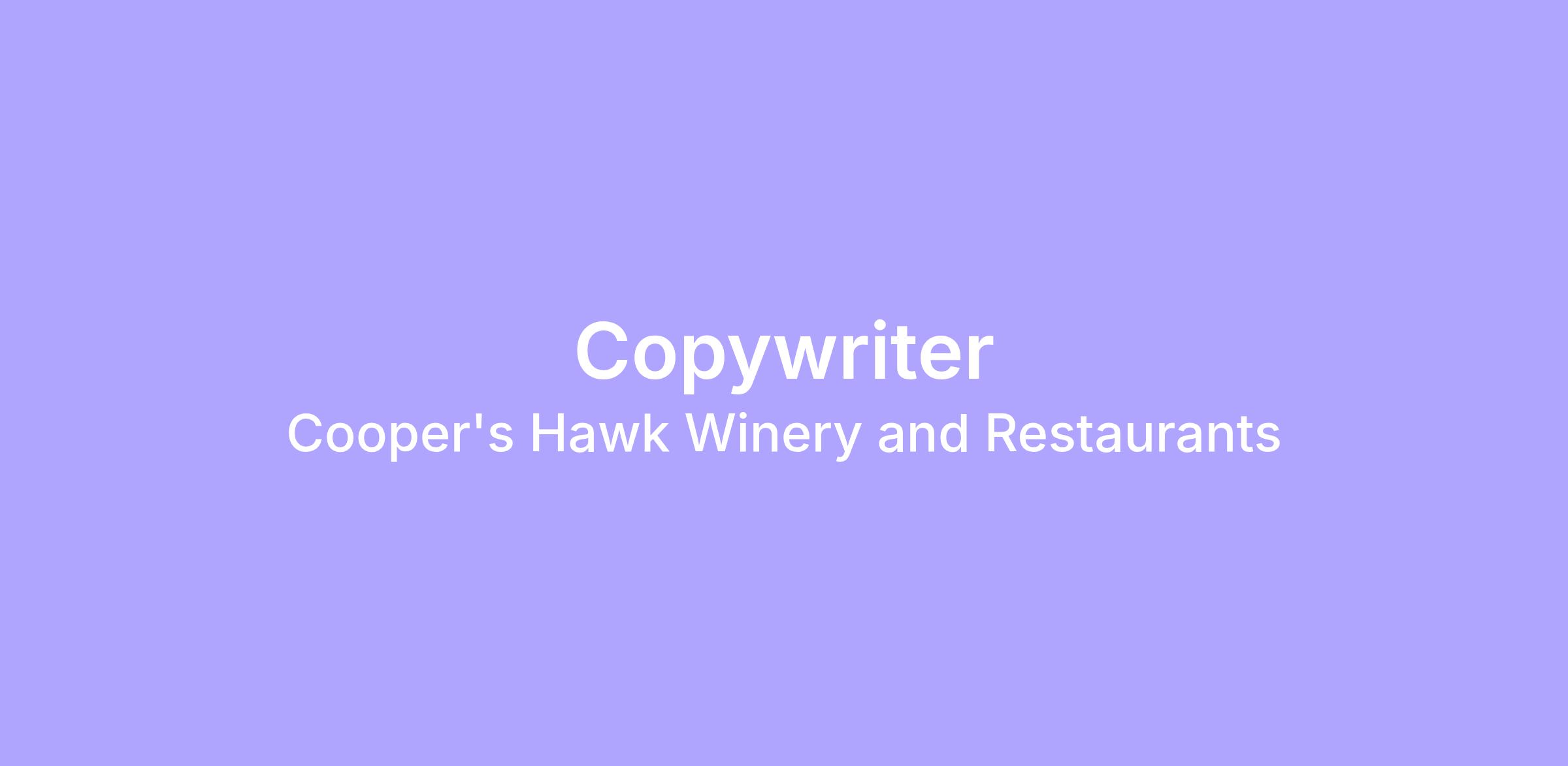 Cooper's Hawk Winery and Restaurants is looking for a digitally fluent, concept-driven Copywriter to join our in-house Brand & Creative team.